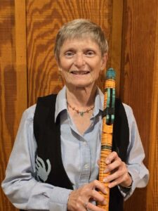 3:00-3:25 | Pendleton Spicer has been involved with music in one way or another all her life. She has played several instruments, allowing music to be a big part of her life. She always loved playing any kind of instrument, but when she discovered the Native American-style flute, she was hooked. That introduction happened New Year’s Even 2001. She taught herself the basics, joined flute circles, participated in numerous classes, took some lessons, and became an accomplished player of heart songs. She can read music but prefers the freedom of playing in her heart. She is fond of saying, as she introduces a song, “You have never heard this song before and most likely will not hear it again.” Pendleton is visually impaired as a result of a stroke that occurred in July 2024. She considers herself very fortunate in that no other part of her body or mind was permanently affected by the stroke. However, her life was turned upside down due to the fact that she can no longer drive, along with losing half her visual field. But that does not stop Pendleton from loving to play her flutes, especially when she can share the music that comes through her and her flutes for others to experience and enjoy.